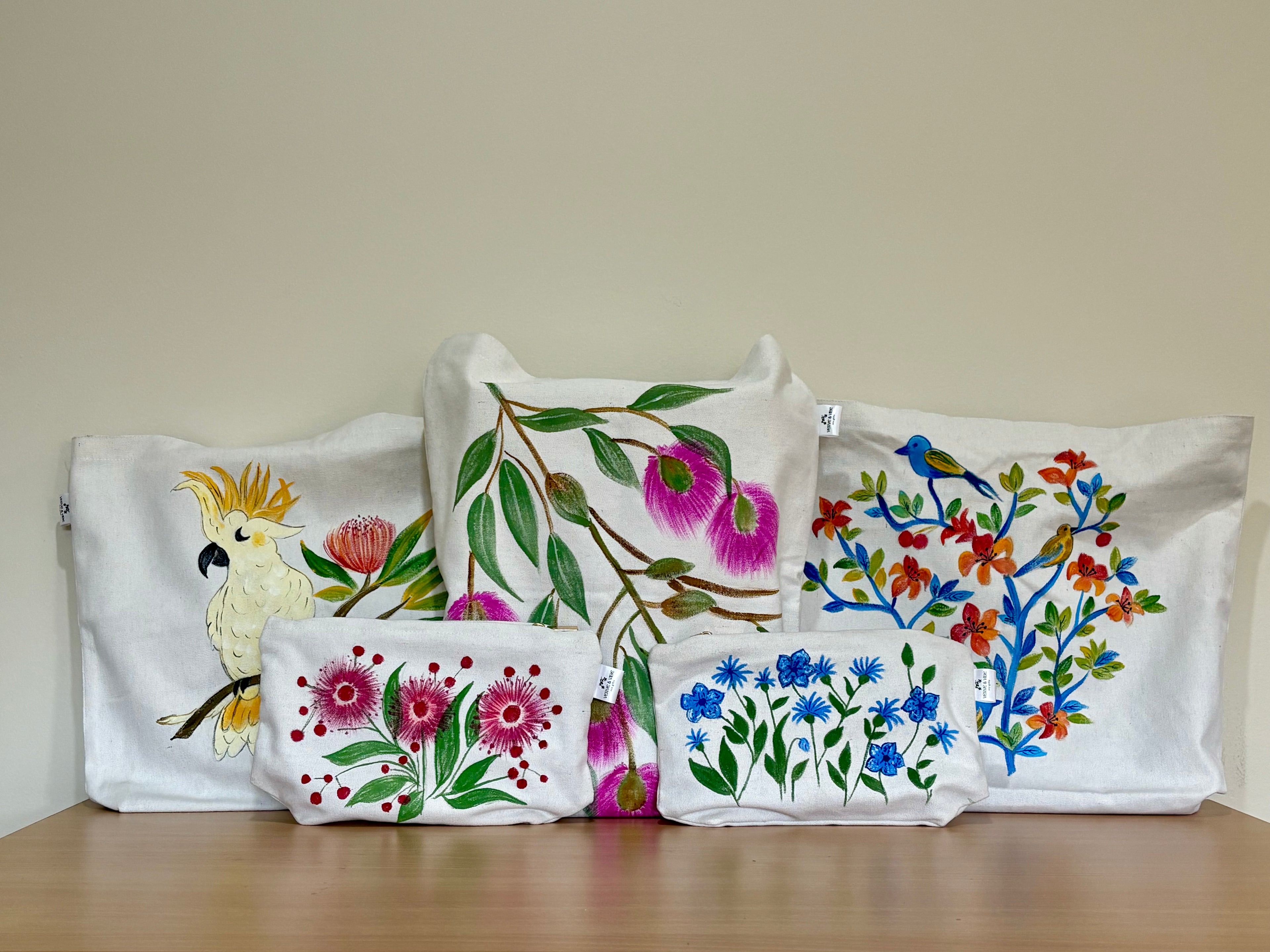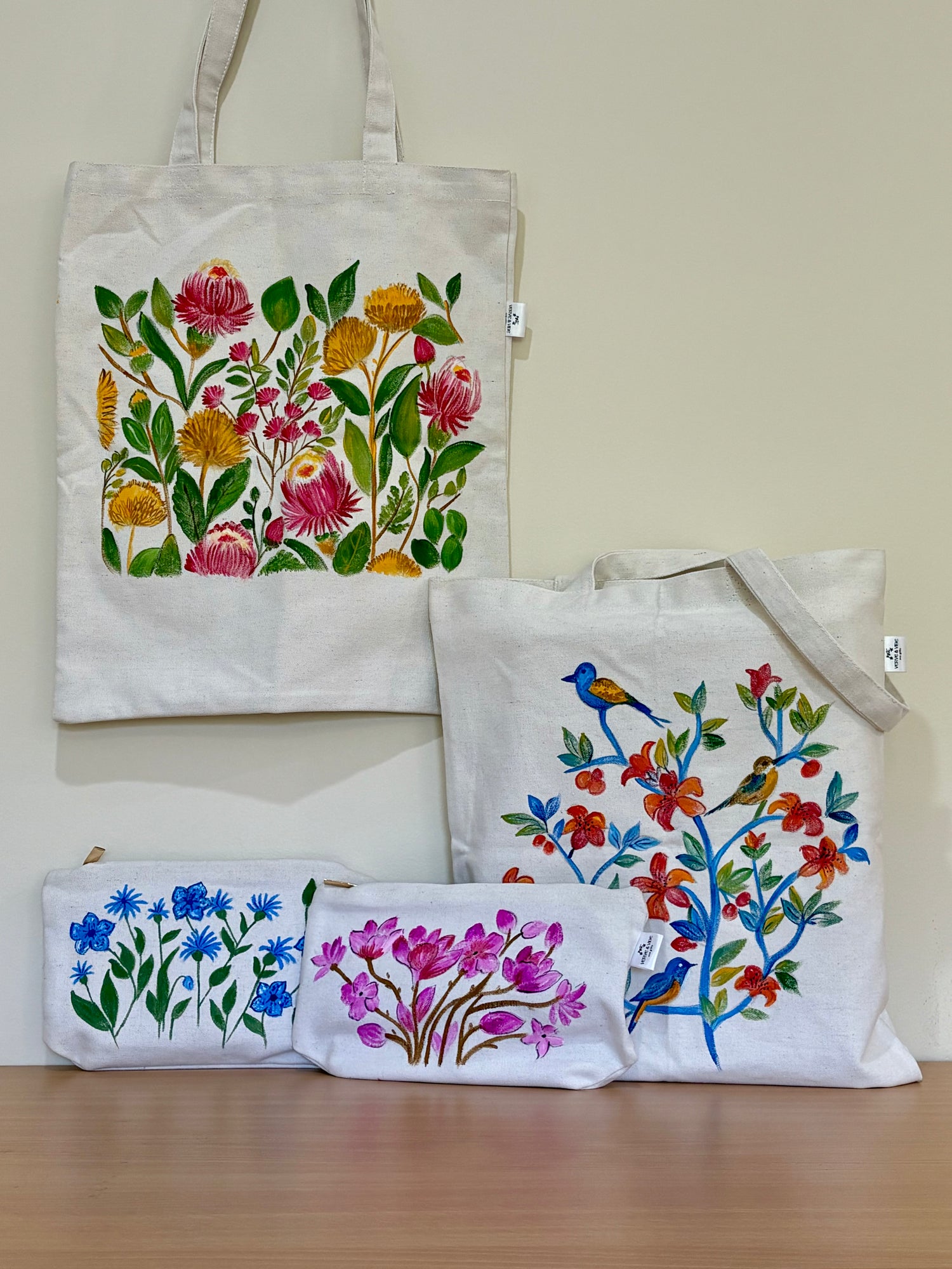 Our Australiana inspired totes & pouches are painted by hand. Yes, painted not printed, hence making each piece unique.