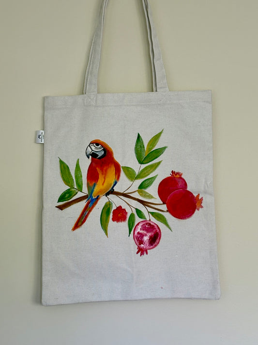 Peppy Parrot & Pomegranates - Hand Painted, Canvas Tote Bag