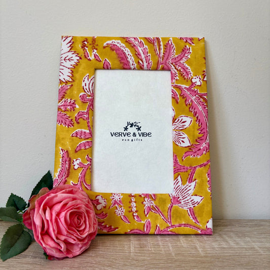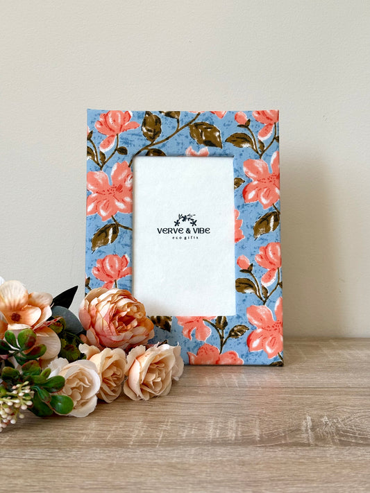 Showcase your favourite moments in style. Made with the 100% recycled, marbled paper board and block printed fabric in beautiful floral designs, these photo frames capture your most precious memories and add a touch of elegance to your living space.