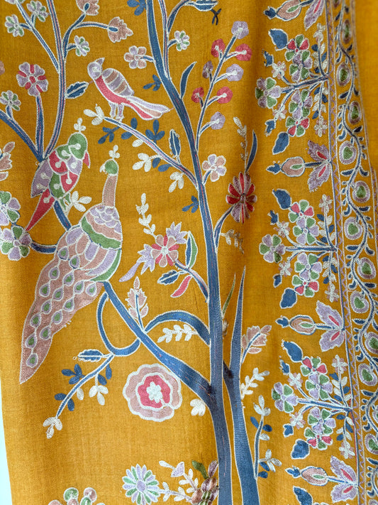 Sozni Jaal - Fine Cashmere Wool Shawl in Rich Mustard with Delicate, Heritage Embroidery