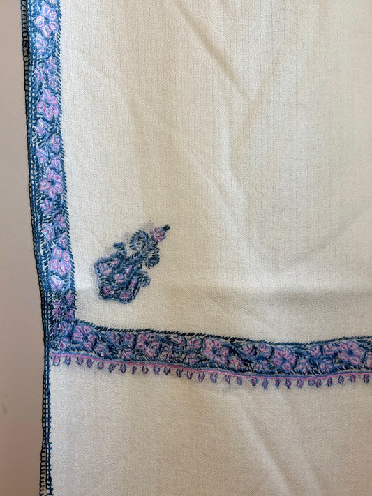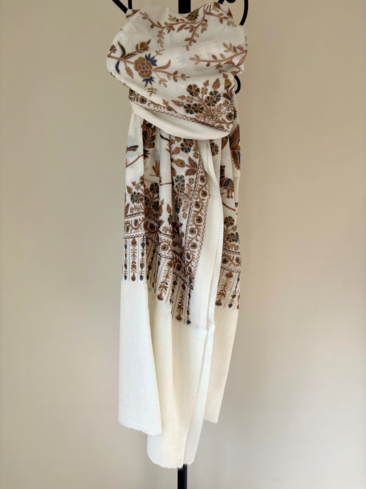 Sozni Jaal - Fine Cashmere Wool Shawl in Timeless Ivory with Delicate, Heritage Embroidery