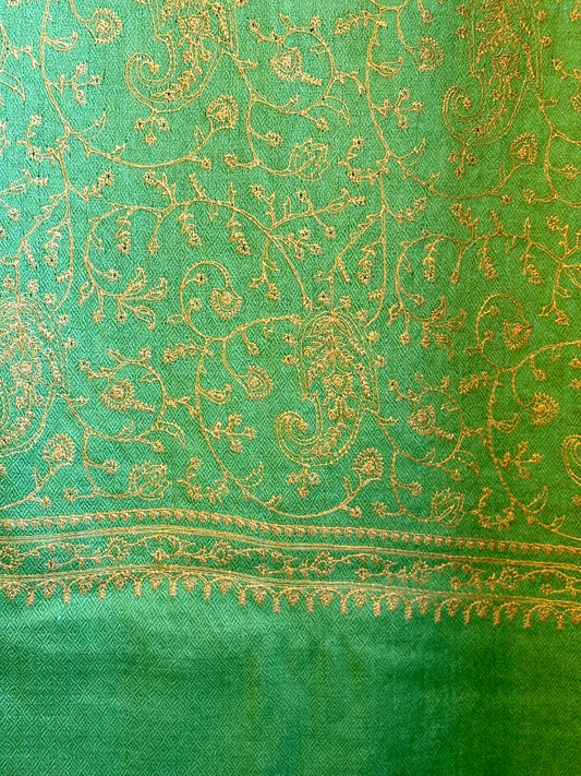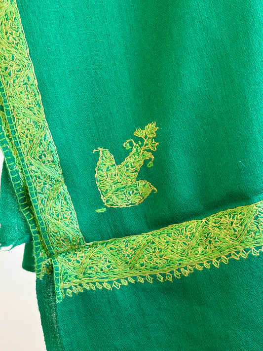 Sozni Hashidar - Fine Cashmere Wool Shawl in Emerald Green with Delicate, Sozni Hand Embroidery