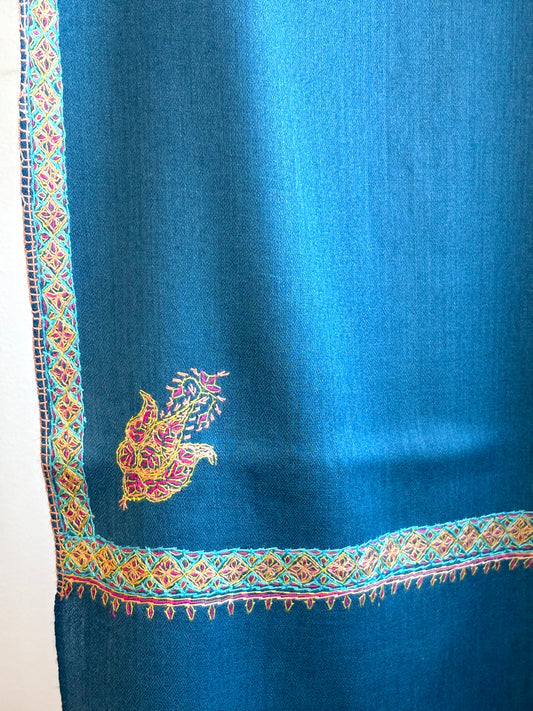 Gorgeous Gulmohar - Fine Cashmere Wool Shawl in Inky Turquoise with Delicate, Heritage Nalki Embroidery