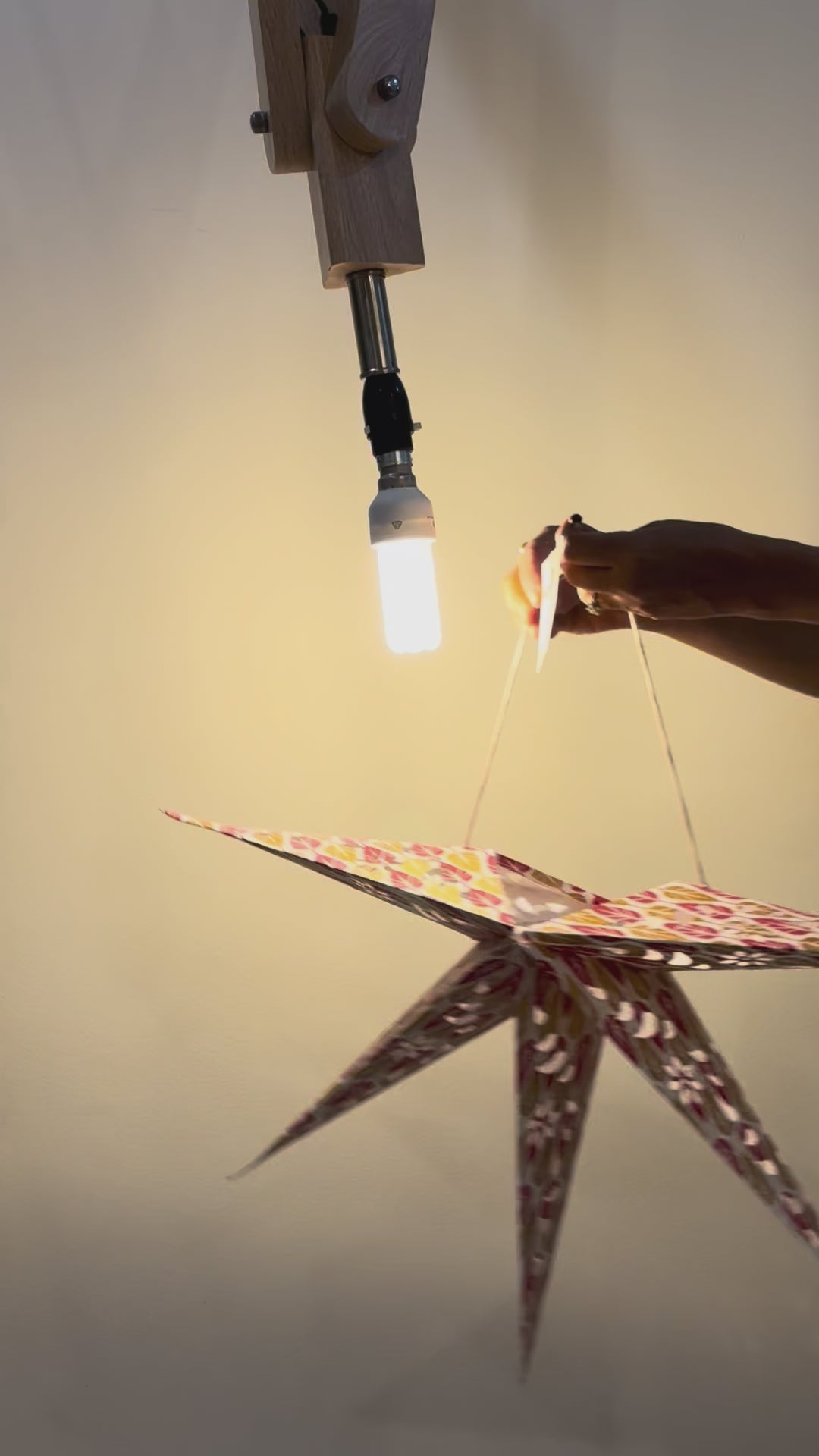- Tie the cords: Bring the two cords together and tie them in a knot over a light fitting. Make sure the star is positioned so it will not touch the light bulb, especially if it is an incandescent one