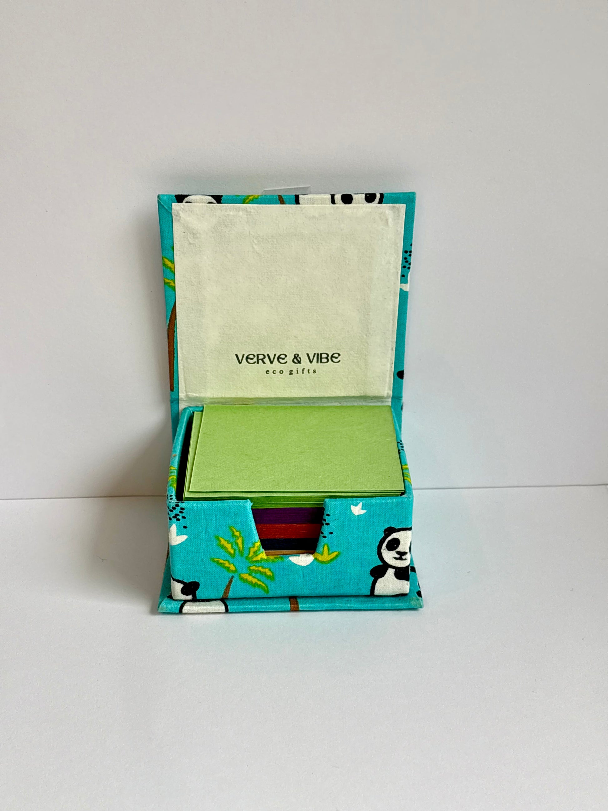 Each set includes fun, vibrant fabric-covered craft journal, photo frame, collapsible pen holder, 3 scented writing pencils and memo box, filled with handmade, 100% recycled, eco-friendly paper in colourful hues.